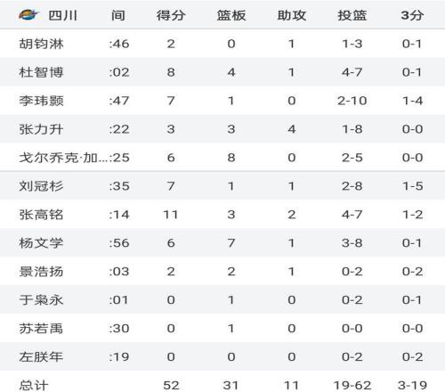 打上海,四川男篮全场得到52分,球队以52:88大败。而前几天,他们输的更惨,那就是对阵北京男篮,那场比赛四川男篮被全方面压制,首节就得到10分,次节更是只拿到6分,整个上半场球队仅有16分入账,比这次输的还要多,最终全队40分钟就拿到46分,被北京男篮狂拉51分(46:97)。四川男篮这赛季到底有多烂呢?数据显示,这赛季7场比赛,他们7战全负,球队0胜7负排名CBA积分榜倒数第一位,他们场均输给对手25分之多,就连实力一般的同曦男篮都能赢他们接近30分。